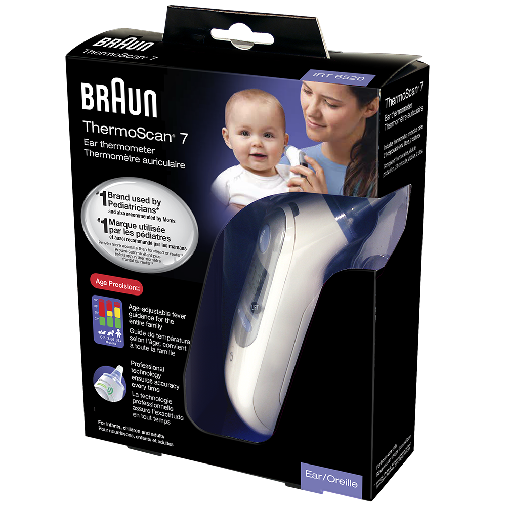 Pour prendre la température d’un enfant et obtenir une mesure précise, les médecins font confiance au thermomètre auriculaire ThermoScanMD, plus qu’à toute autre marque**, notamment en raison du bout de la sonde qui est préchauffé. Les autres thermomètres, dont le bout n’est pas préchauffé, risquent de refroidir l’endroit où la lecture est prise, ce qui pourrait entraîner des mesures erronées. Grâce à une technologie brevetée, le bout de la sonde du ThermoScanMD est préchauffé avant l’utilisation pour prévenir ce problème et procurer des mesures de précision professionnelle. De plus, le système de guidage ExacTempMC confirme, au moyen d’un voyant lumineux et d’un bip sonore, que le positionnement du thermomètre est adéquat pour prendre la température et effectuer une mesure précise. Vous allez également apprécier les embouts jetables certifiés Braun qui aident à prévenir la contamination croisée d’un utilisateur à l’autre. Et grâce à son nouvel écran de grand format et à sa conception ergonomique, le ThermoScanMD Braun est plus que jamais facile à utiliser.